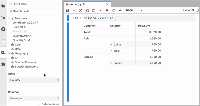 atoti.Cube.query(). The"raw"mode uses a faster data transfer technique than the one used by the default"pretty"mode, leading to drastic performance improvements for larger query results (issue #146).include_totals parameter to