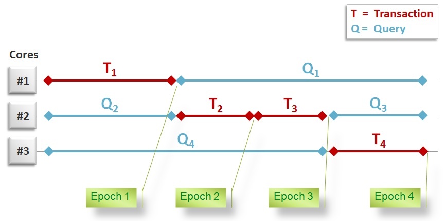 The Epoch Counter is incremented whenever a transaction is committed to the Datastore. The Epoch Counter (otherwise known as Epoch Id) becomes the new version number for the Datastore. For each new epoch, a new timestamp is also recorded.