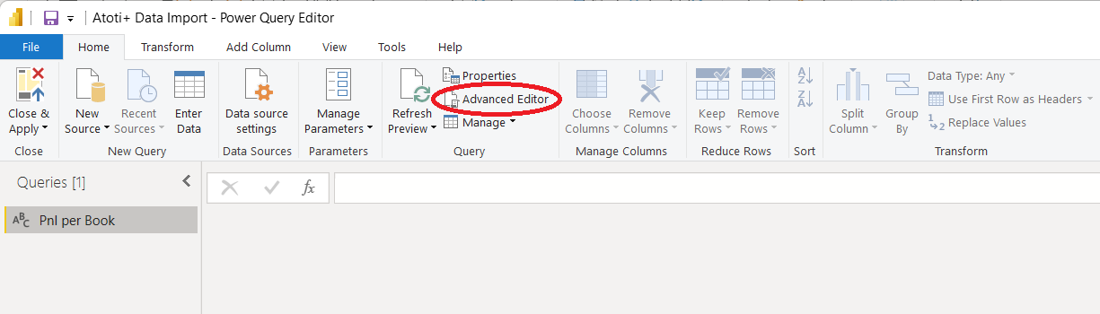 In the Power Query editor, click on the "Advanced Editor" from the ribbon. We are going to describe the connection details and the MDX query to the Atoti+ cube using the Power Query M language.