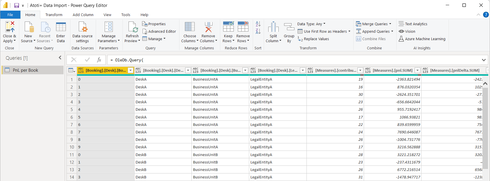 In the advanced editor window, describe the cube connection and the MDX query. For this example we are connecting to the ActivePivot Sandbox cube, and retrieve PnL metrics at the book level. Note that the MSOLAP client library must be installed on the computer for the Power Query script to work. Otherwise you'll get an error telling you that it is not installed. You can get the MSOLAP client library from there: https://docs.microsoft.com/en-us/analysis-services/client-libraries