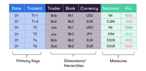 In our example, for simplicity, the resulting cube is shown separately for the 'Notional aggregations and for the 'PnL' aggregations. In reality, all the measures will exist in one cube.
