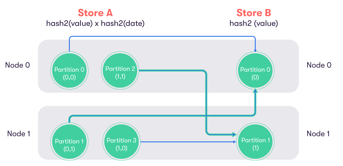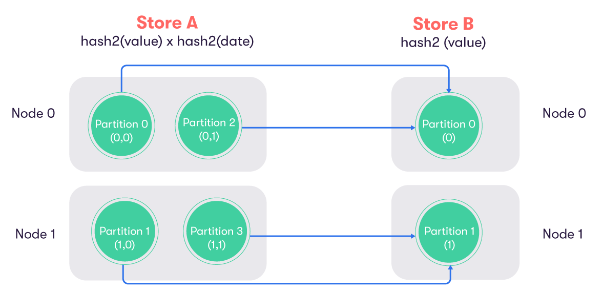 Target store partitioning:value(A) | hash2(B)This partitioning is valid, as all fields of the target store partitioning are present in the owner store, and