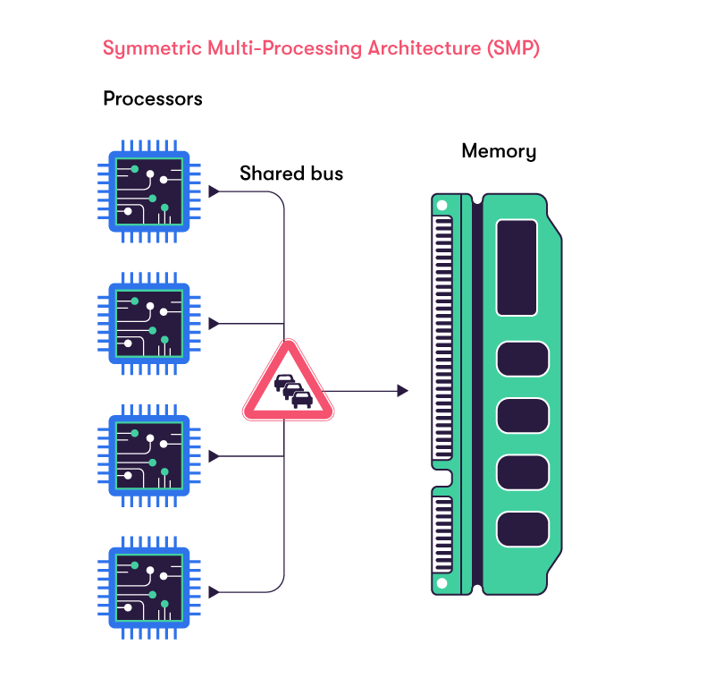In the following schema is shown the SMP architecture, which is using a single shared system bus to feed all processors: