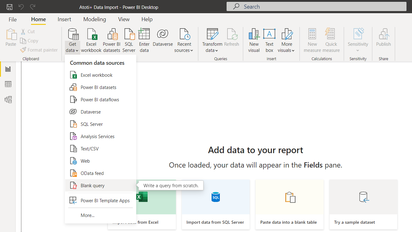 Open Power BI, click on "Get Data" drop down menu from the ribbon, select the "Blank Query" data source type. This will open the Power Query editor.