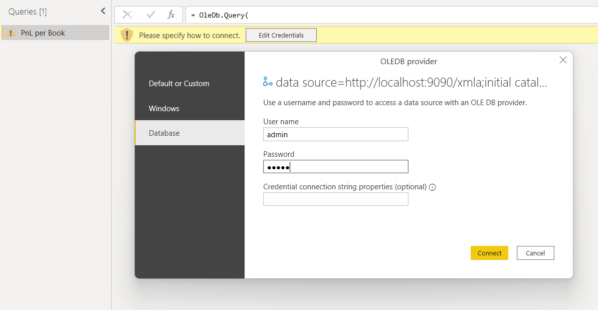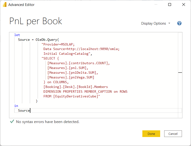 In the advanced editor window, describe the cube connection and the MDX query. For this example we are connecting to the ActivePivot Sandbox cube, and retrieve PnL metrics at the book level. Note that the MSOLAP client library must be installed on the computer for the Power Query script to work. Otherwise you'll get an error telling you that it is not installed. You can get the MSOLAP client library from there: https://docs.microsoft.com/en-us/analysis-services/client-libraries