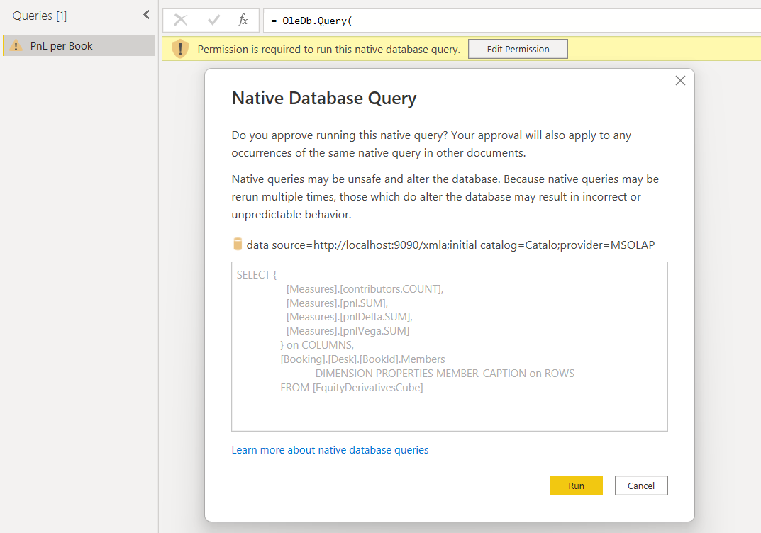 Click on "Done" and Power Query will display a warning to remind you that you are running a native query on a database. You must approve this query by clicking on "Run".