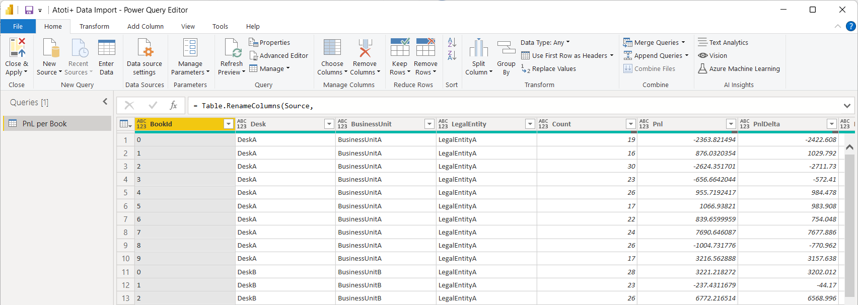 Power Query will connect to the Atoti+ cube, run the MDX query and present the result set to you. From that point you can use the Power Query features to rename, remove and reorder columns, or even filter some rows out and do other transformations. The MSOLAP provider returns fully qualified names for cube levels and measures, which you will probably want to rename into something more intelligible.