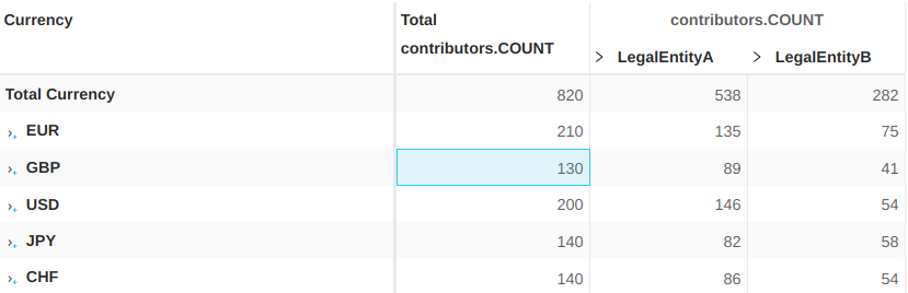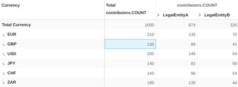 The above query filters on LegalEntityA and N/A for the Desk level (because of the selection), and on EUR for the Currency level (because it is the MDX default member).