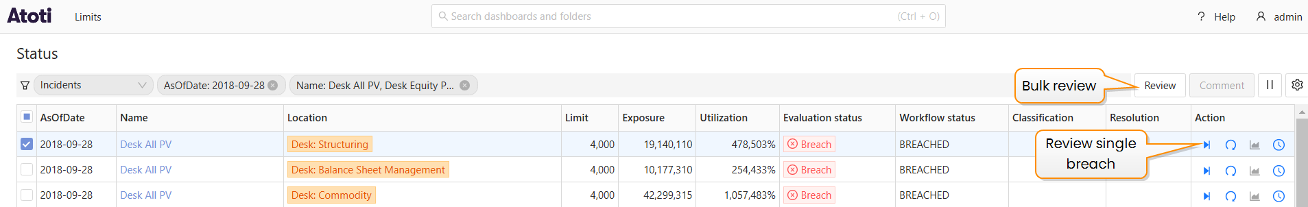 You can select multiple incidents of the same type, that is, breaches or warnings, but you can’t select a mix of breaches and warnings for bulk review.