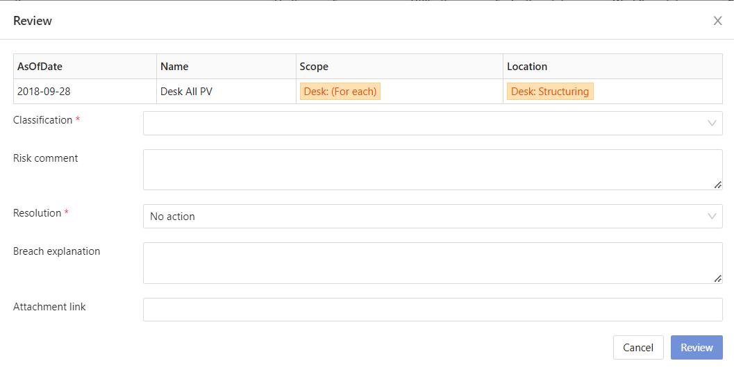 | Risk comment | Provide optional extra information on the selected Classification. |