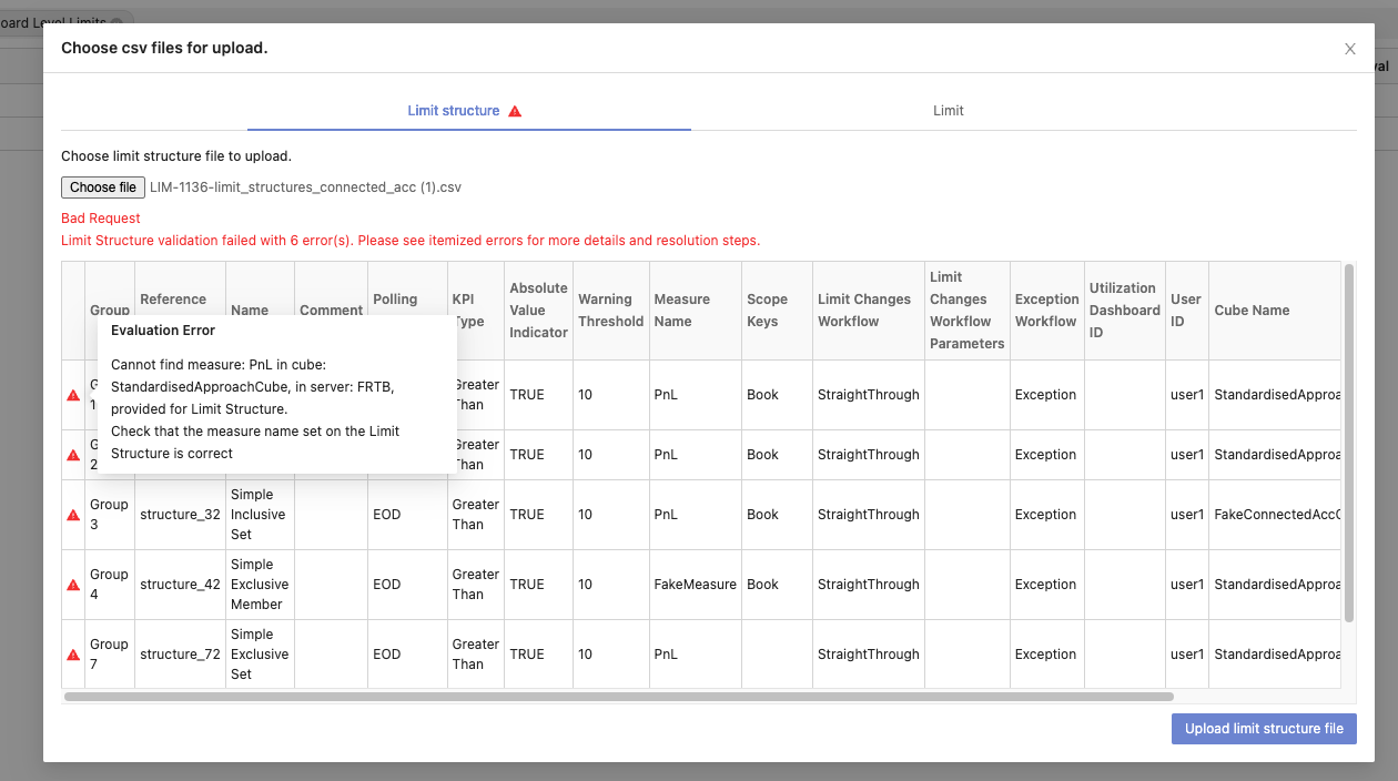 Click Upload limit structure file/Upload limit file. If there are any errors, the preview displays detailed error messages: