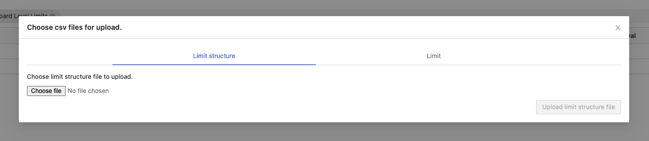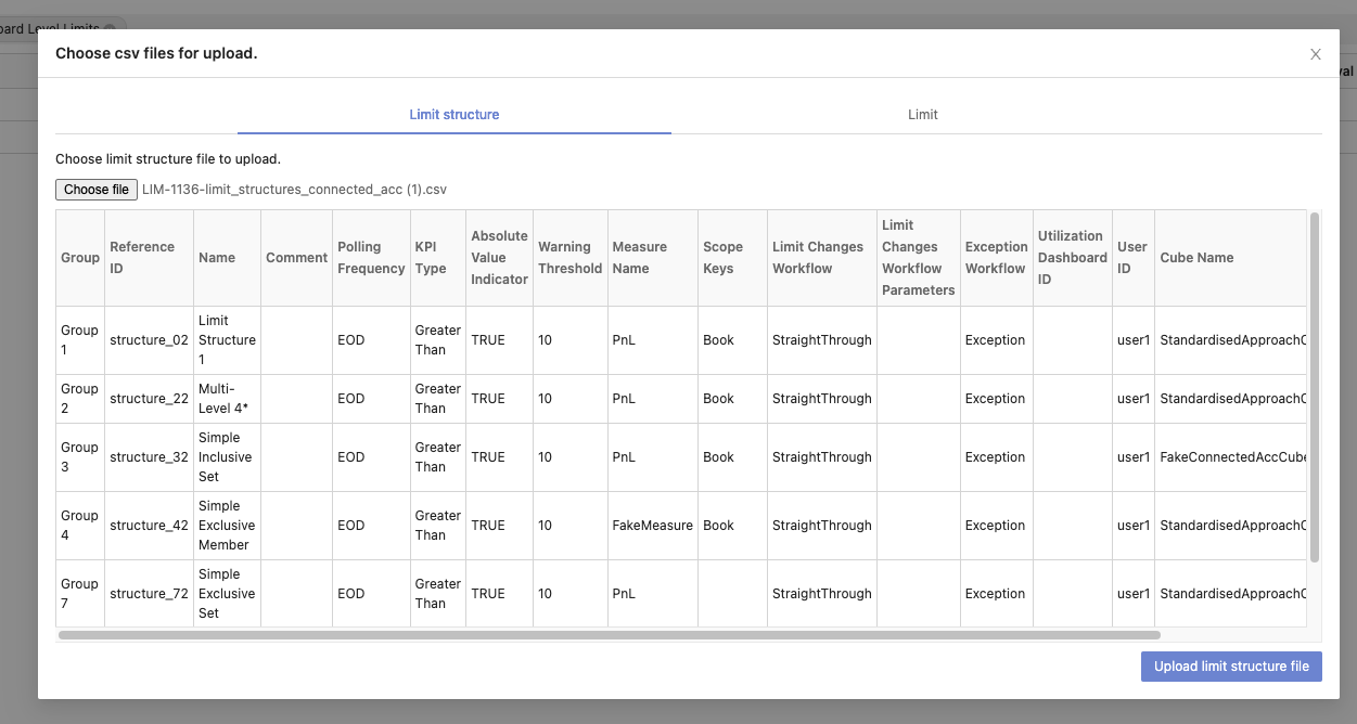Upload a Limit structure file. For details on the valid input file, see Limit Structure. If you haven’t got any limit structures created, upload this first.