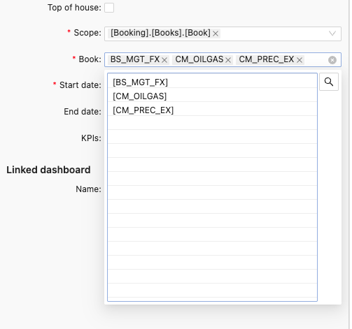 | Scope | This requires Top of house to be disabled. Determines which cube location each task under this definition applies to. The scope is made up of any level of the currently selected cube, and a corresponding value from said level. Multiple scopes can be added to a single task definition, determining a set of cube hierarchies to filter on. Select a hierarchy’s level from the dropdown to display a popover with all members of the selected hierarchy, then click the required members to create the scope. If the member you wish to select is not in the cube, you can click the icon in the top right hand corner of the scope selector to enter a custom member. note The filter condition only uses the EQUALS operator. |
