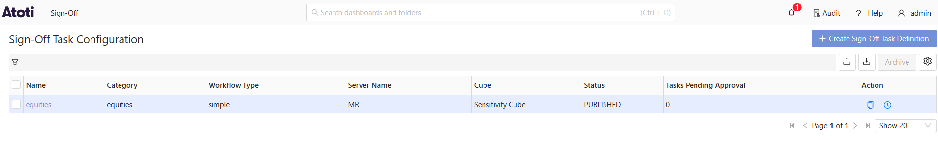 | Create Sign-Off Task Definition | Manually create one task definition at a time. In the default workflow, the tasks definitions are initially saved, not automatically published. |