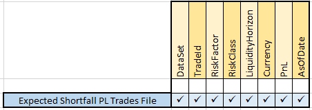 PnL | Double | The PnL vector for 12 months’ worth of data - there is one value per day, which needs to be computed for a liquidity horizon of 10 days in the risk engine - the values are separated by a semi-colon. This is effectively an extra ‘PnL vector Liquidity Horizon’ column to use as the reference into the new PnL Vector store. This new column will be copied from the existing Liquidity Horizon column for lines in the input files where PnL vectors exist. Then once the file is loaded (or transaction complete), a second pass will fill in the gaps by adding facts with missing Liquidity Horizons and existing PnL vectors. The advantage gained from this is that ‘Liquidity Horizon gaps’ do not need to be filled any more. |